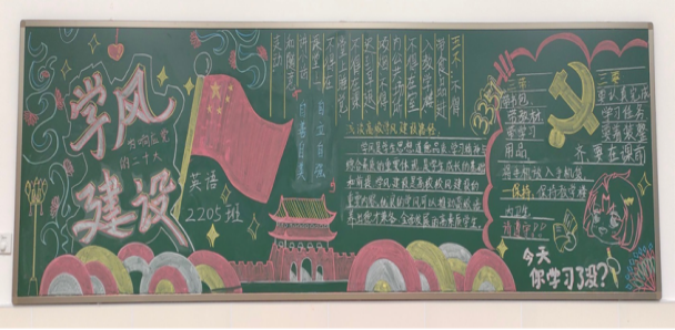 商英专2201班黑板报秉承着学校“三带、三要、五不、一保持”的要求,充分发挥规则调动学生学习的积极能动性,浓厚学院的学习氛围。