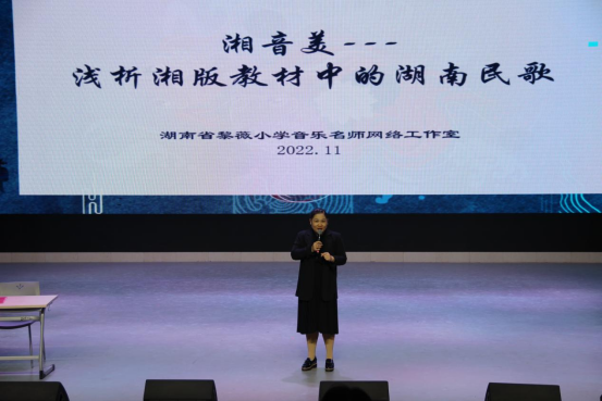 《湖南民歌研习》为省级一流艺术类社会实践课程,为体现课程教学特色,多元化教师授课模式,11月3日晚,我校音乐学院邀请到了湖南黎薇小学音乐名师网络工作室首席名师,长沙市首批、第四批卓越教师黎薇,为音乐学院2019级同学们开展专题讲座:《湘音美——浅析湘版教材中的湖南民歌》。该课程将原有的分班分教室授课模式换为11个班线上线下混合式授课,活动过程严格按照疫情防控要求开展。