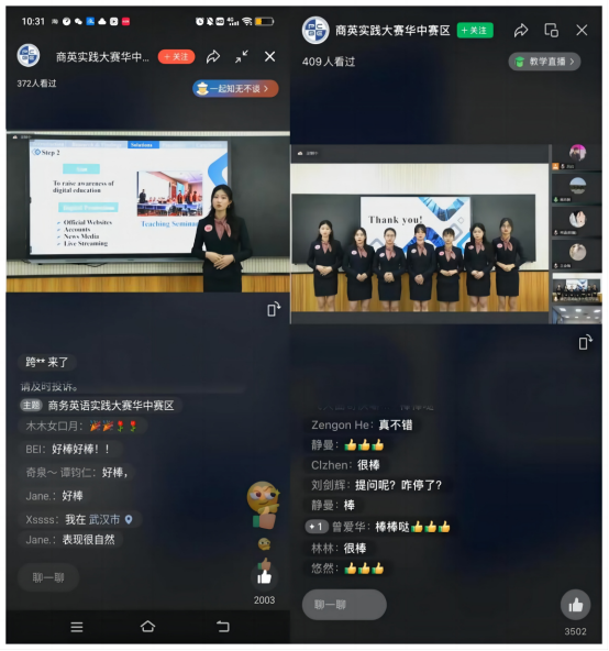 11月12日周六上午9点,外国语学院组织全体教师观看了商务英语实践大赛华中区赛的比赛直播。外国语学院的参赛队伍第4个出场,参赛学生们10分钟的实践展示,尽显英语口语实力,尽展外语技能风采,赢得了全体教师满屏的点赞叫好。