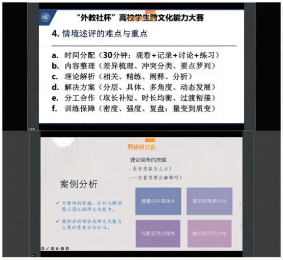 同日下午2点,外国语学院组织全体教师观看了外教社跨文化能力大赛专题研修。此次专题研修邀请了杭州电子科技大学的王一安教授、复旦大学的时丽娜副教授、北京语言大学的依涵副教授,分别从跨文化能力评价、跨文化案例开发、跨文化能力大赛备赛等方面对大赛流程、关键环节及教学实践融合进行了经验分享,推动了“教”“学”“赛”的有机联动,对外国语学院参加跨文化能力大赛具有启发和借鉴意义。