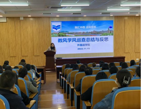 为保障抓实抓严教风、学风建设工作,切实营造良好的教学氛围,我校外国语学院于11月15日中午,在综合楼D202会议室召开了教风学风巡查总结与反思会议。外国语学院院长姚佩芝、副院长曾望、教学督导组以及外国语学院全体教师到会。本次大会由曾望副院长主持,学院教学督导组组长秦裕祥教授做汇报。