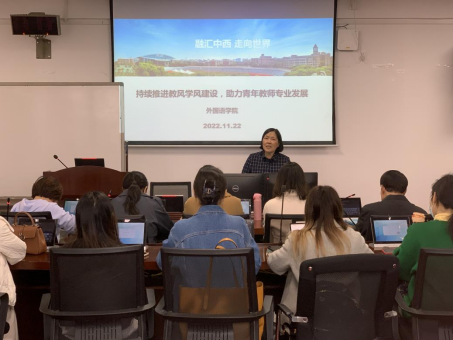 为了深入推进教风学风建设,促进青年教师导师制培养规范化,加快教、学、研人才梯队建设,11月22日,外国语学院在五教603会议室召开了青年教师导师制培养工作专题会议。外国语学院教学副院长曾望、教学督导组组长秦裕祥教授、40名青年教师和导师出席了会议。本次会议由姚佩芝院长主持。