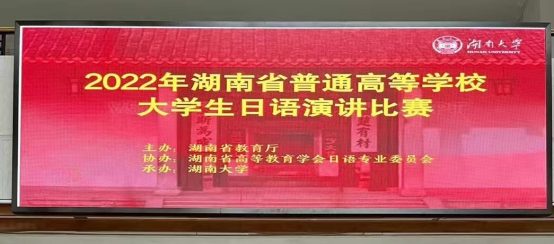 11月26日,由湖南省教育厅主办、高等教育学会日语专业委员会协办、湖南大学承办的2022年度湖南省普通高等学校大学生日语演讲比赛圆满落幕。本次大赛采取线上模式、以湖南大学为主会场,在来自全省的高校志愿者师生的协力与见证下顺利进行。全省18所高校及独立学院日语专业50余名选手代表各自学校参加比赛。本次大赛分为四年级组、三年级组、二年级组,由命题演讲和即兴演讲两个环节组成。