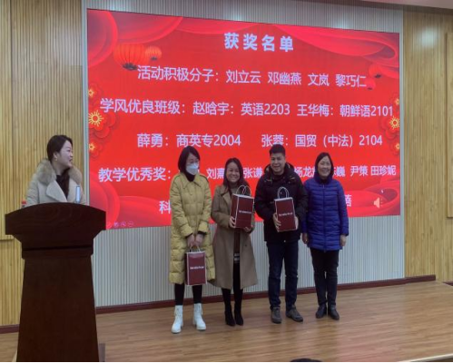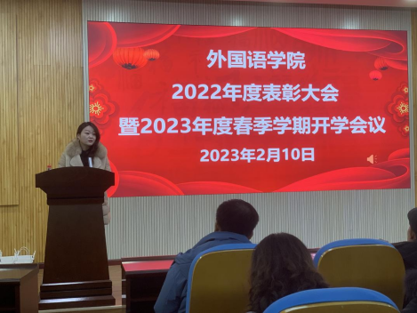 为表彰先进、凝聚力量,进一步激励全院教职员工的积极性和创新性,推进并落实学院2023年度春季学期各项工作,于2月10日,我校外国语学院在综合楼D202会议室召开了2022年度表彰大会暨2023年度春季学期开学会议。外国语学院院长姚佩芝、副院长曾望、党总支书记尹理智、教学督导组以及外国语学院全体教职员工到会。本次大会由副院长曾望主持。