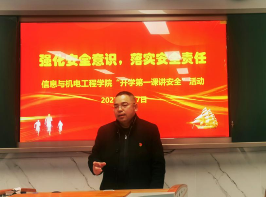 为了深入贯彻落实全国全省安全生产电视电话会议精神,推动压实教育安全主体责任,确保春季开学校园安全稳定,2月7日下午,我校信息与机电工程学院联合安全保卫处举办了题为“强化安全意识,落实安全责任”的“开学第一课讲安全”活动。学院全体管理干部、辅导员、实验室管理人员参加了此次活动。
