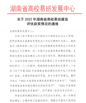 近日,湖南省高校易班发展中心发布《关于2022年湖南省高校易班建设评优获奖情况的通报》,我校获评“2022年度湖南省高校易班建设先进单位”。