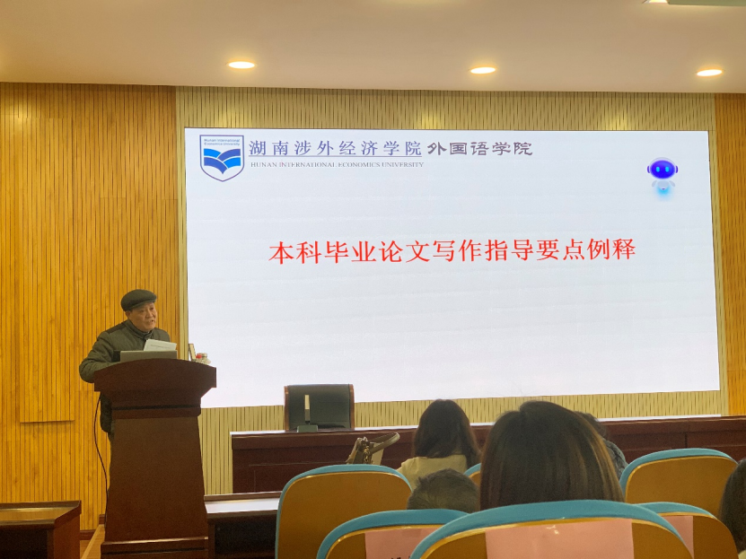 为规范毕业论文指导要求,稳步推进和完善下一步毕业论文的相关工作,提高毕业论文质量,2月24日中午,外国语学院督导组组长秦裕祥教授在综合楼D202多功能厅,为所有一线教师开展本科毕业论文写作指导要点例释专题讲座。外国语院长姚佩芝、副院长曾望以及外国语学院全体教师到会。