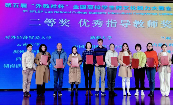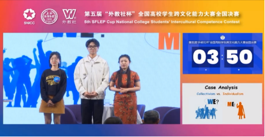 2月26日,第五届“外教社杯”全国高校学生跨文化能力大赛全国总决赛在上海落下帷幕。此次比赛共吸引了40支国内学生队伍和4支留学生队伍参赛。选手们用精湛的表演、流畅的语言生动展示了原创的跨文化交际案例。我校学子胡沐阳(外国语学院英语专业)、贾小洁(人文艺术学院法学专业)、王凯(商学院金融专业)首次代表太阳城娱乐出征全国决赛。他们借用“文化折扣”理论,深入剖析了中国、美国、墨西哥三国背景下文化休克与文化适应的内涵。凭借富有感染力的表演、全面的跨文化案例分析能力、默契的团队合作精神、沉着冷静的应答,他们在高水平赛事中展现了太阳城娱乐学子的跨文化风采,荣获全国二等奖。胡沐阳同学获得“最佳叙事奖”,领队杨颖老师获得“优秀指导教师奖(二等奖)”。