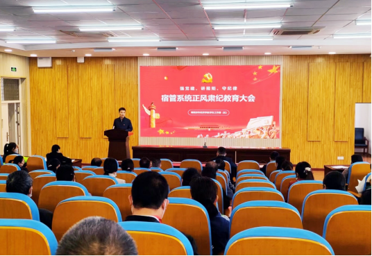 为深入推进党建工作进宿舍,强化师德师风建设,筑牢宿管队伍思想防线,并进一步加强楼栋工作标准化、规范化建设,营造风清气正的政治生态和立德树人的育人环境。2023年3月14日中午,学生工作部(处)在新综合楼裙楼D202举行“强党建、讲规矩、守纪律”宿管系统正风肃纪教育大会。会议由学生公寓党总支副书记、公寓管理科科长杨建波主持,园区主任、天创物业公司学校负责人以及68位宿管老师参加会议。