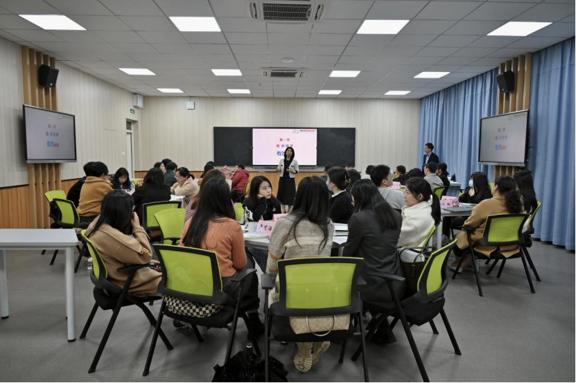 孙晓老师就学生在每节课中的专注时间与老师们展开探讨,引导并组织老师们进行经验分享。韩奉林老师就BOPPPS教学模式六大元素、BOPPPS教学设计关键环节——学习目标展开讲解,指出要从认知、技能、情意三方面明确学习目标,并强调参与式学习的重要性。