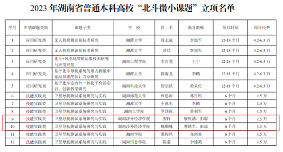 近日,湖南省教育厅公布了2023年“北斗微小课题”立项名单,我校8个项目获批立项。其中我校信息与机电工程学院6名学生进行申报,全部获批立项,创造了我校在该项目上的最佳成绩。