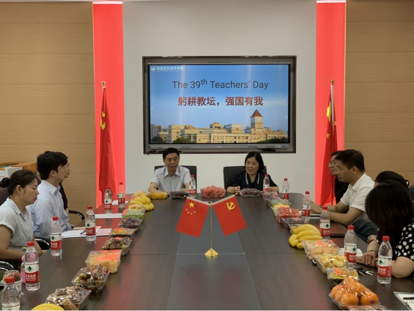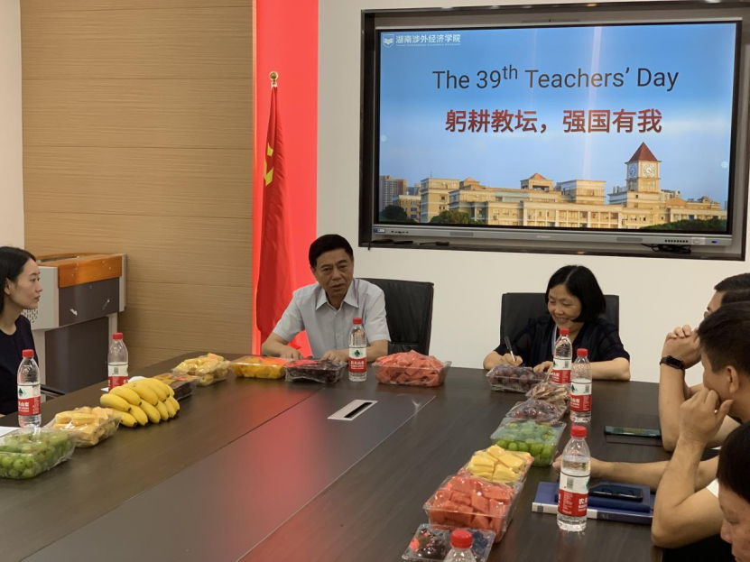 姚佩芝院长首先代表外国语学院祝所有与会人员及全院教师教师节快乐。尹理智书记就学院党建工作取得的成绩及今后工作发展做了简要发言。曾望副院长总结了近三年学院在教学工作中取得的成绩,介绍了新教师入职培训的进展与效果,并希望新教师热爱教师职业,虚心向老教师学习,努力工作,为学院的发展做出贡献。