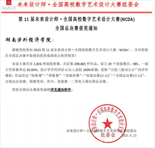 近日,第十一届未来设计师·全国数字艺术设计大赛组委喜传佳音,祝贺我校在全国总决赛中取得优异成绩。