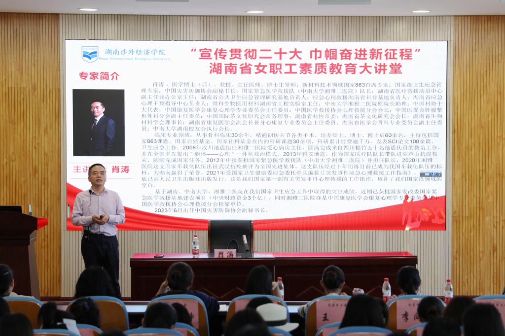 10月18日下午,“宣传贯彻党的二十大、巾帼奋进新征程”湖南省女职工素质教育大讲堂在我校开讲。新材料技术领域国家863首席专家、中国灾害防御协会副秘书长、中国康复医学会康复心理学专业委员会主任委员、中国医学救援协会心理救援分会会长、中南大学湘雅二医院教授肖涛以《中国茶文化之身心疗愈》为题,为学校女教职工代表共200余人带来了一场精彩纷呈的讲座。讲座由校党委委员、校工会女工委主任李琼主持。