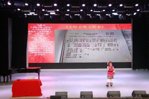 首先是讲座部分,由桑植民歌传承人黄道英带着在座师生走进桑植,讲述了桑植民歌的传承过程以及成为“非遗”过程中遇到的艰辛;介绍了桑植民歌的各种类型,如:浑圆嘹亮的山歌、欢快活跃的灯调、高亢的革命歌曲以及优美的抒情小曲;然后通过带领学生对桑植民歌《去哒去哒又转来》《三根丝线三尺长》中特殊的方言咬字的学习,让音乐学院学子直观感受到了桑植本土方言融入歌曲后所特有的韵味,体会着民歌旋律中流淌的真情实感。