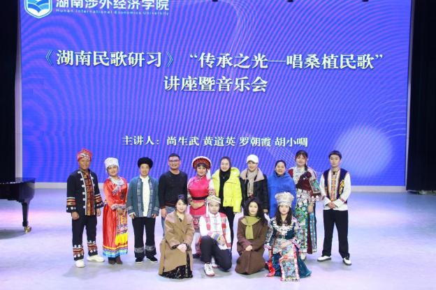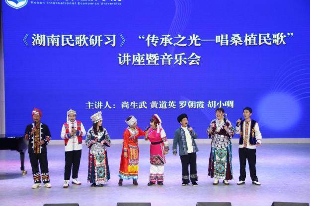 《湖南民歌研习》是我校音乐学院开设的一门立足于湖南本土民歌的学习与研究,侧重社会实践的省级一流课程,除了基本的课堂教学外,为帮助师生进一步把握湖南本土民歌的特色、体验民族文化的魅力,12月15日,本课程组特邀桑植民歌国家级代表性传承人尚生武、桑植民歌市级代表性传承人黄道英、知名桑植歌手罗朝霞和胡小啁与本院学生一起在音乐楼实验剧场举行别开生面的“传承之光——唱桑植民歌”讲座暨音乐会,此次活动由《湖南民歌研习》课程负责人、公共艺术系主任彭翔主持,2020级音乐学专业大四全体学生参与。
