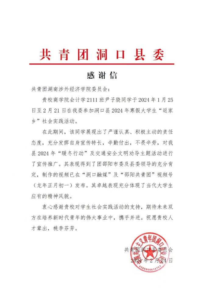第二封信则对商学院会计学专业2111班学生尹子骁在邵阳市洞口县2024年寒假大学生“返家乡”社会实践活动中的卓越表现表示感谢。信中写道:尹子骁同学的表现得到了团邵阳市委及县委领导的充分肯定。衷心感谢贵校对学生社会实践活动的支持,期待未来双方在培养新时代青年的伟大事业中,携手并进。