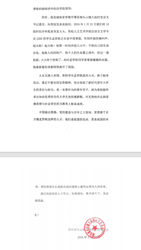 第一封信对我校人文艺术学院汉语言文学专业2206班学生孟哲帆面对火灾,敢于挺身而出,事后不留名的宝贵精神表示感谢。信中写道:孟哲帆同学是一名善作为的青年学子,深为贵校能培育出如此优秀的当代大学生而倍感骄傲,可见贵校在弘扬道德思想与社会责任担当教育上彰显成效。
