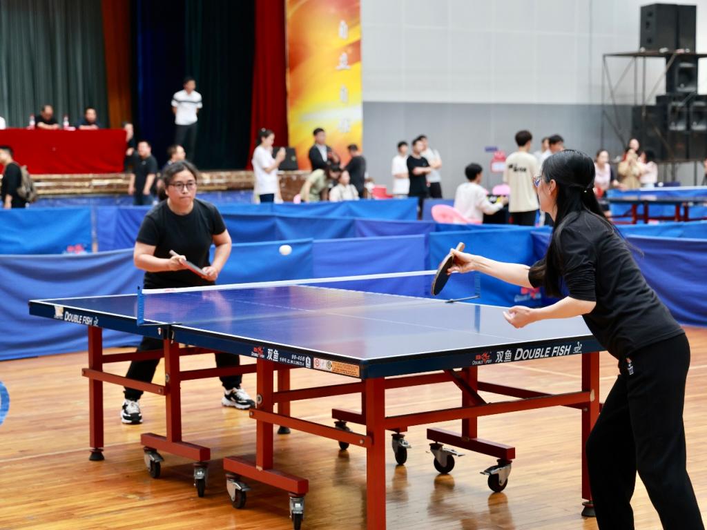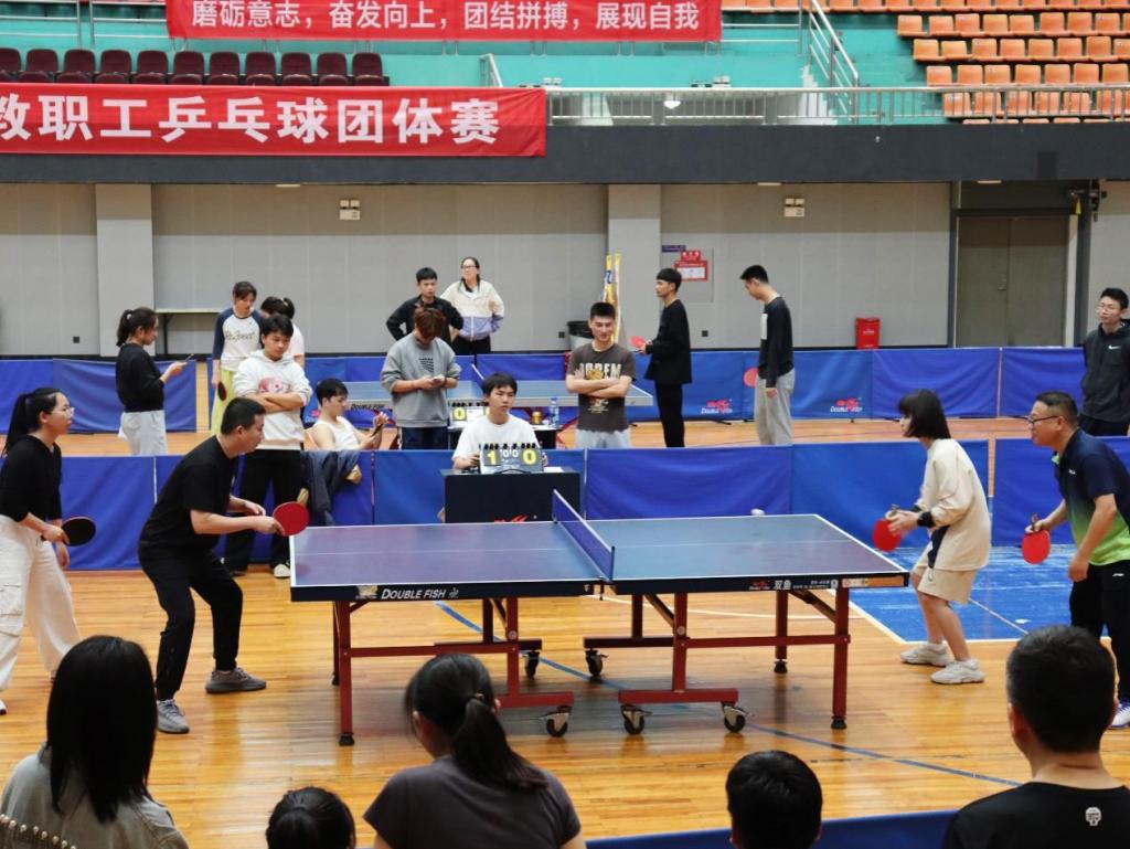 比赛现场精彩纷呈,气氛热烈。赛场上球拍飞舞,银球飞旋;参赛教职工灵敏矫健、精神抖擞、各施技艺;直拍、横拍、扣球、旋转球、弧线球等精彩场面频现,推挡、快拉、扣杀,打法各不相同,赢得现场观众阵阵喝彩。比赛悬念迭出、扣人心弦,充分彰显出团队协作的力量;运动员们在你来我往之间以球会友,将体育精神和精湛球技精彩展现。