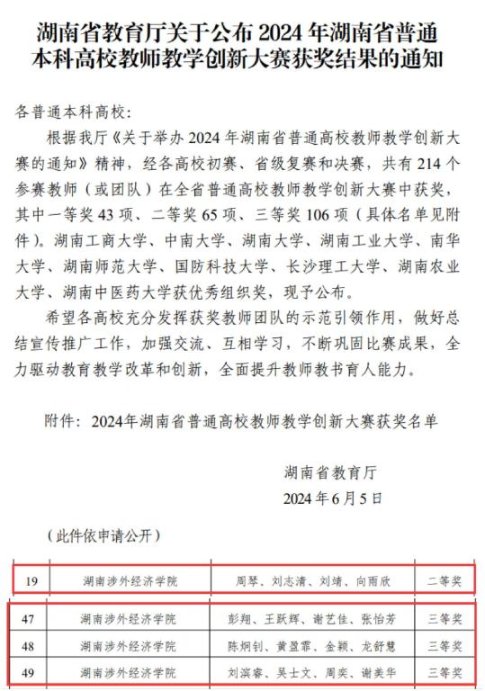 近日,湖南省教育厅主办的第四届普通高校教师教学创新大赛落下帷幕,我校教师在这场全省范围内的教学盛事中大放异彩,四个参赛团队共斩获一个二等奖、三个三等奖的优异成绩,为我校的教学创新工作再添新篇章。