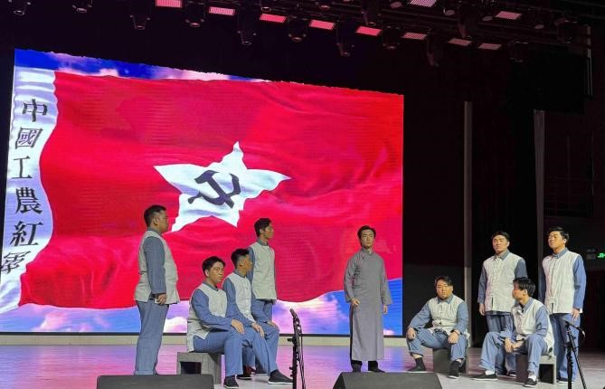 舞台上,学生们通过动人的唱词与表演将一幕幕波澜壮阔的历史画卷徐徐展开,生动再现了中国共产党人打响武装反抗国民党反动派第一枪的伟大时刻,展现了起义军人们为了民族独立和人民幸福英勇斗争、不畏牺牲的场景。在座观众被一段段感人至深的剧情吸引,沉浸在历史的回响与艺术的魅力之中。