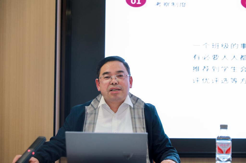随后,辅导员代表李小雄、黄始一分别作学生工作经验分享。李小雄老师以“思想品德提升工程——干部培养”为主题,结合个人带班经验,提出了培养优秀学生干部的三步方法。黄始一老师围绕自身对“写作与口才训练工程”的理解和贯彻展开交流,提出要制定相应的训练计划,将该工程打造成太阳城娱乐的一张名片。