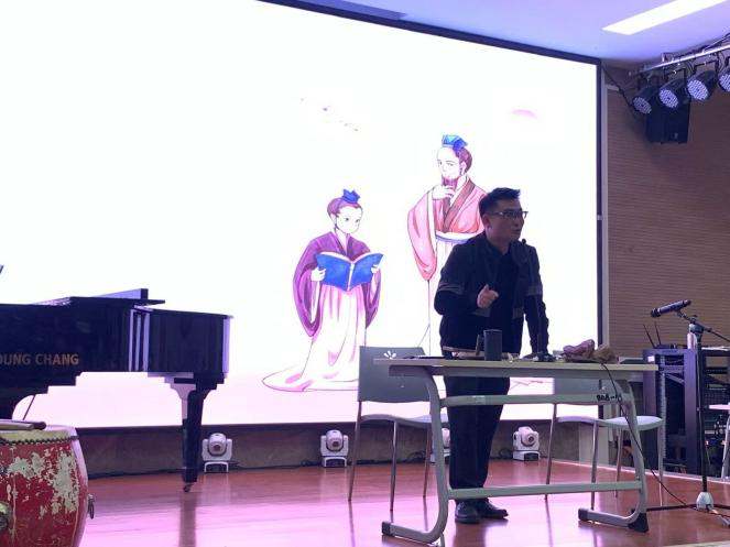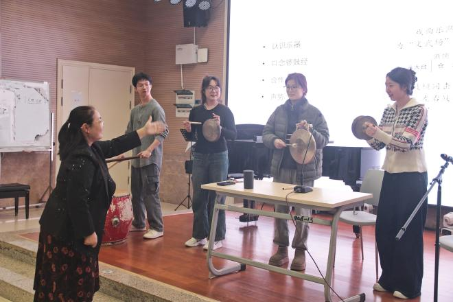 陈瑾教授长期致力于将传统文化融入现代音乐教育的实践探索,讲座中,她围绕2022版教育部新课标要求下中小学不同年级学生戏曲音乐教学的共性与个性特点进行叙述,并提出了一系列有效的教学策略:学习戏曲操,让学生迅速融入课堂氛围;开展趣味畅游,了解民族打击乐器,并邀请学生上台学习简单锣鼓经的演奏;从方言语调在戏曲学习中的重要性阐述地方民族戏曲的灵魂所在。