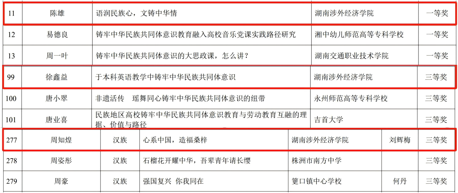 陈雄老师的作品《语润民族心,文铸中华情》荣获一等奖;徐鑫益老师的作品《于本科英语教学中铸牢中华民族共同体意识》荣获三等奖;周知煌同学(指导老师:刘辉梅)的作品《心系中国,造福桑梓》荣获三等奖。