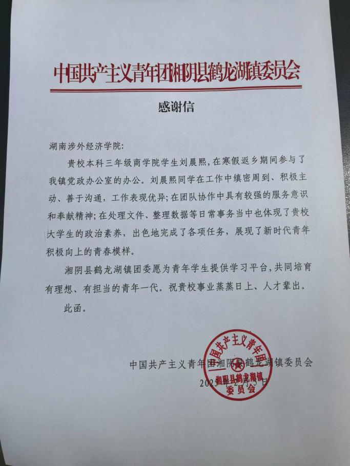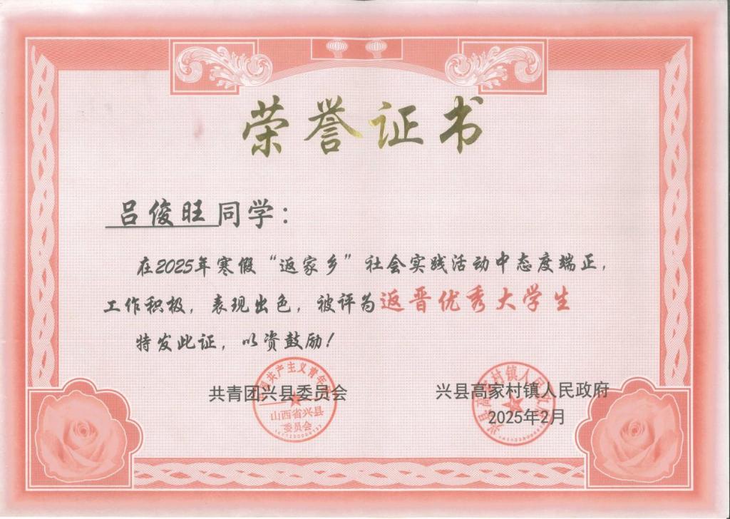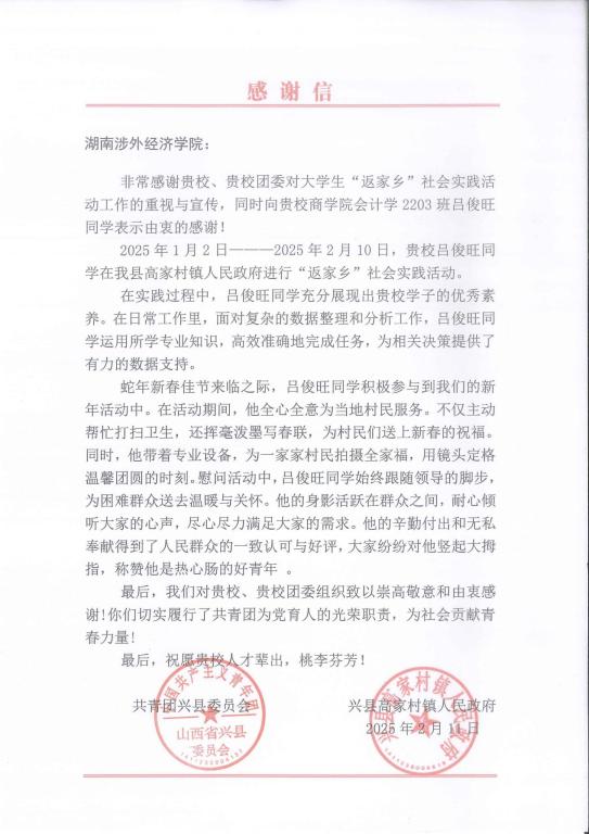 会计学2203 班的吕俊旺同学,获共青团兴县委员会和兴县高家村镇人民政府联名感谢。他运用专业知识,高效梳理分析复杂数据,为当地决策提供有力支撑。新春佳节,他还发挥特长,写春联、拍全家福、参与大扫除、新春慰问,获评“优秀返晋大学生”。
