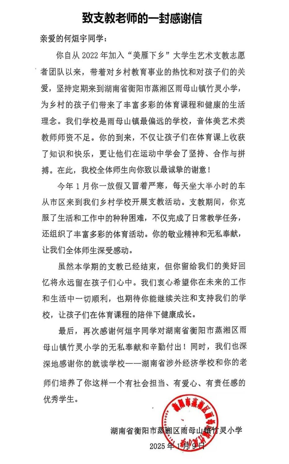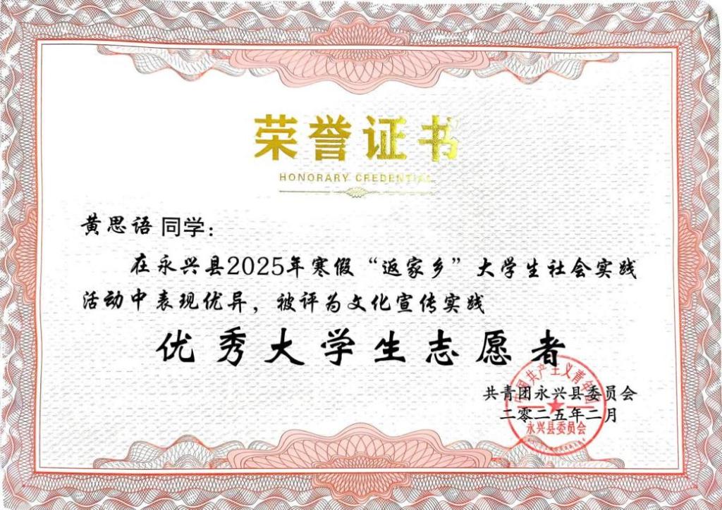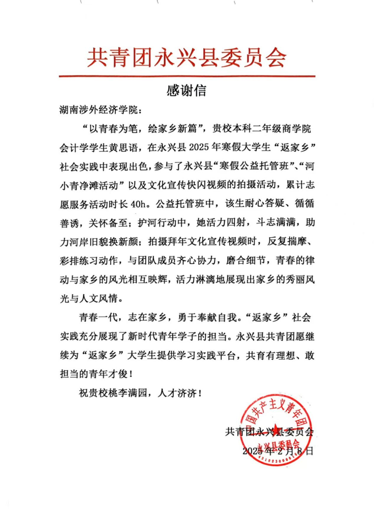 会计学2304班学生黄思语,受共青团永兴县委员会表扬。她在“寒假公益托管班” 辅导功课,参与 “河小青净滩活动”,并在文化宣传视频拍摄中展现家乡风貌,荣获文化宣传实践优秀大学生志愿者称号。