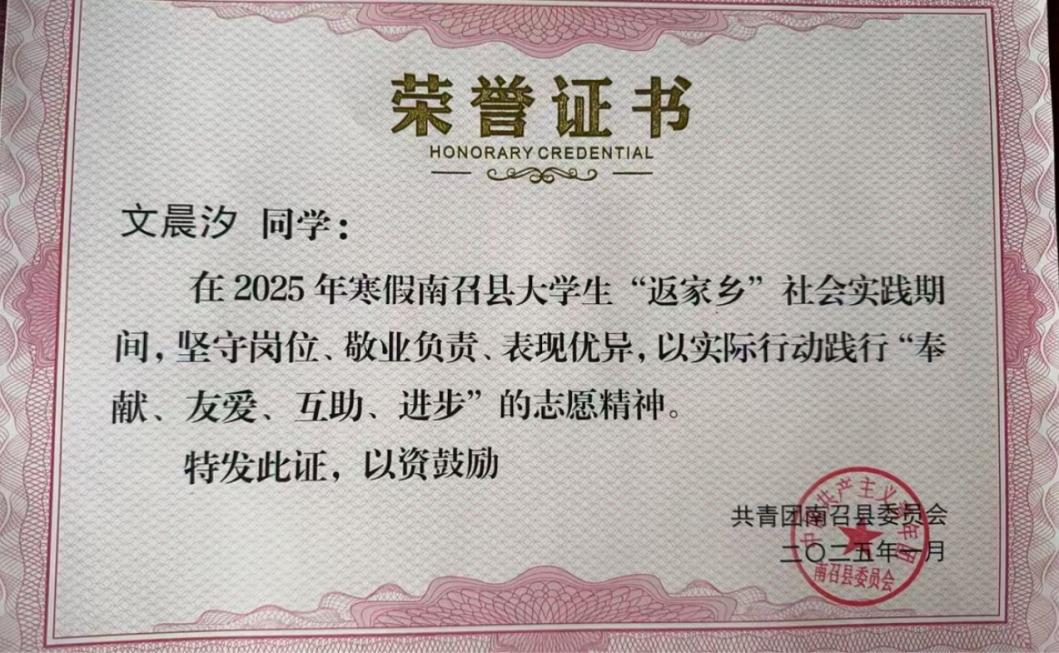 金融2402 文晨汐同学在南召县大学生 “返家乡” 实践中,于组织志愿者活动、宣传及基层团组织建设等方面表现突出,获共青团南召县委表彰。