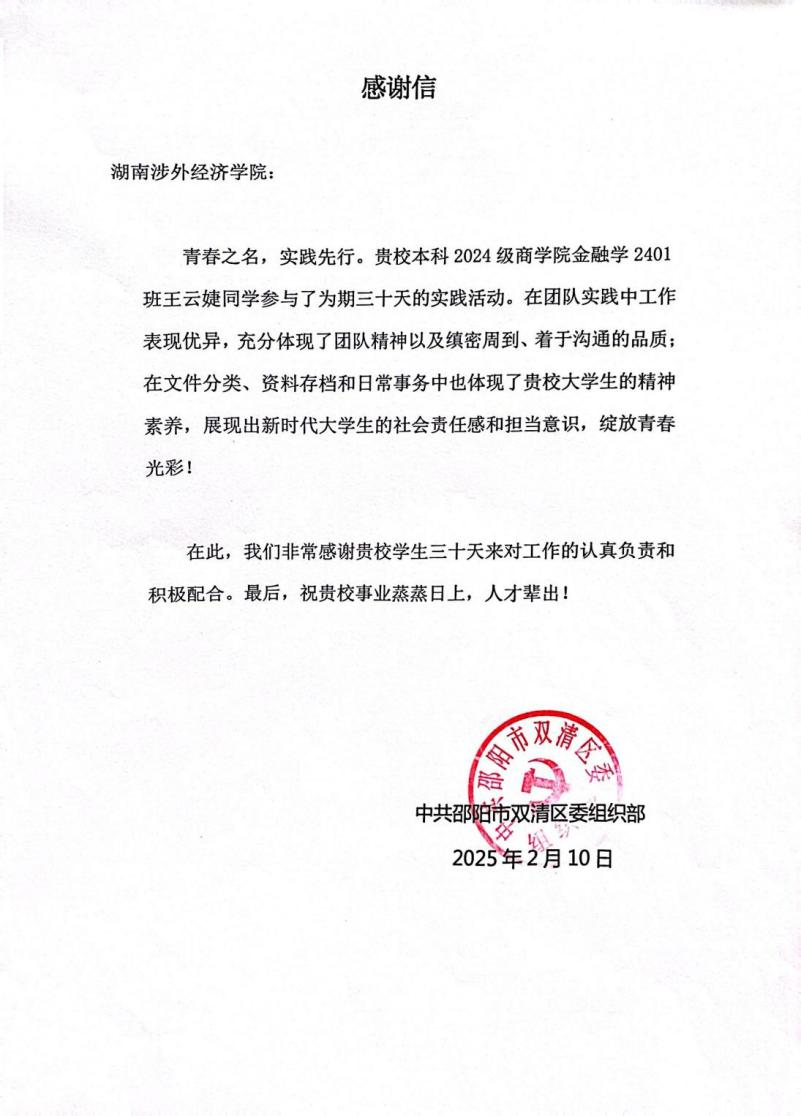 中共邵阳市双清区委组织部表扬了商学院金融学2401班的王云婕同学。在为期三十天的实践活动中,无论是团队协作项目还是独立承担的任务,她都能以高度的责任感和饱满的热情全身心投入,充分体现了新时代大学生强烈的社会责任感和担当意识。