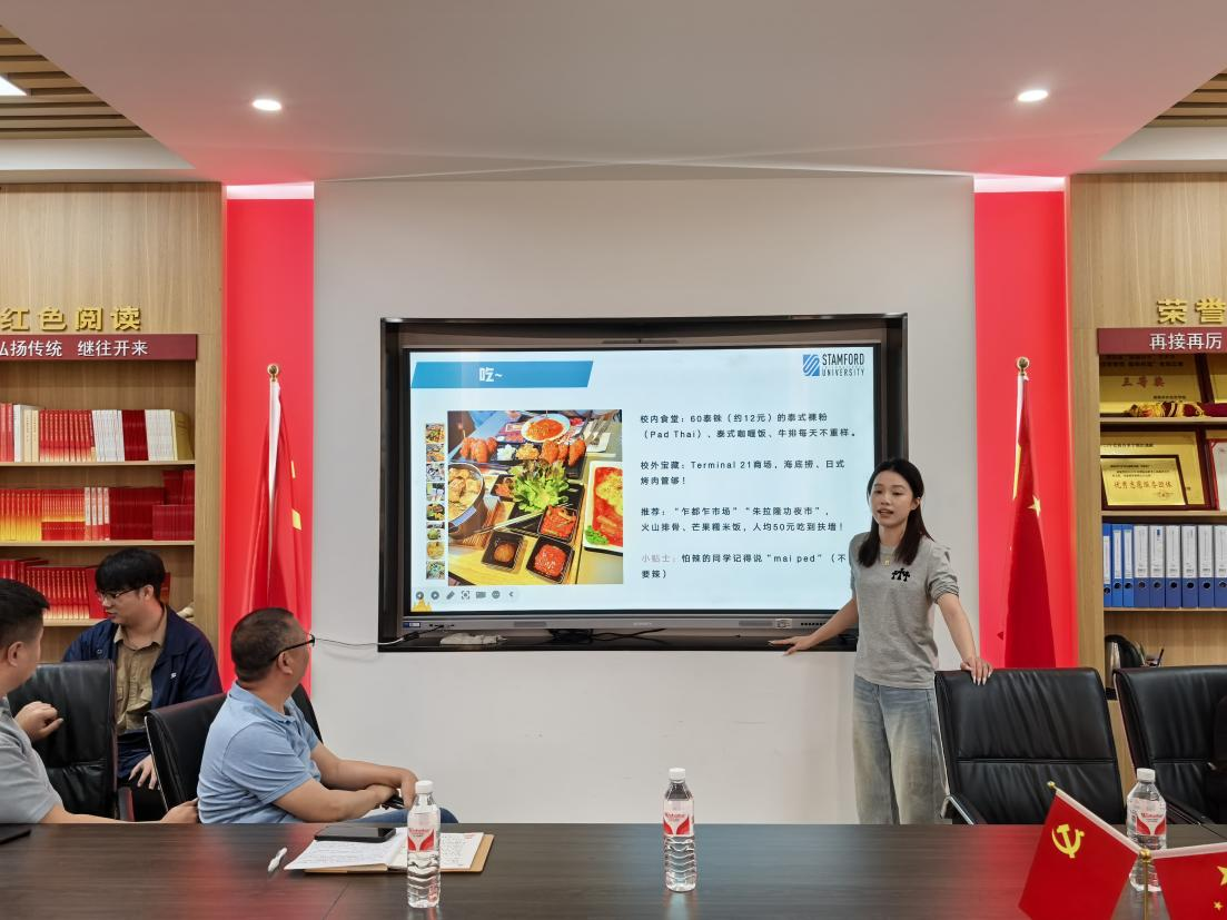 学工处罗芷璇老师则从校园生活和文化体验角度切入,分享了自己与来自不同国家留学生交流的有趣经历。她指出,这种跨文化交流对于拓宽个人视野、丰富人生阅历有着不可替代的重要性。两位老师的分享内容详实、生动,让与会者对泰国斯坦福国际大学的留学生活有了更直观、全面的认识。