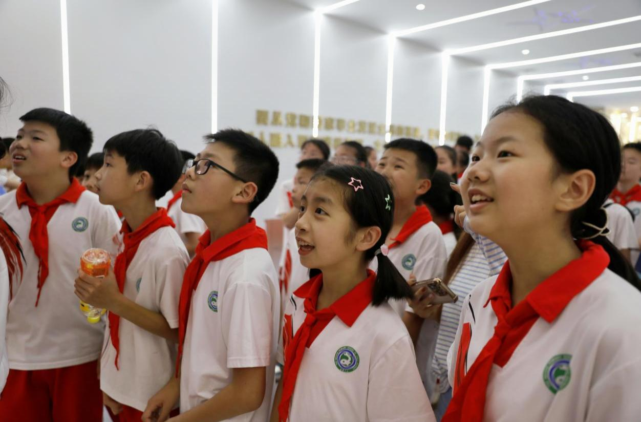 在“中国人民站起来了”展区,以新中国成立为背景的巨大历史画卷吸引众人目光。一位小学女生感慨:“在这里看到许多书本之外的故事,心中种下了红色种子,也更明白了‘没有共产党就没有新中国’的意义,我们会努力当好共产主义接班人。”