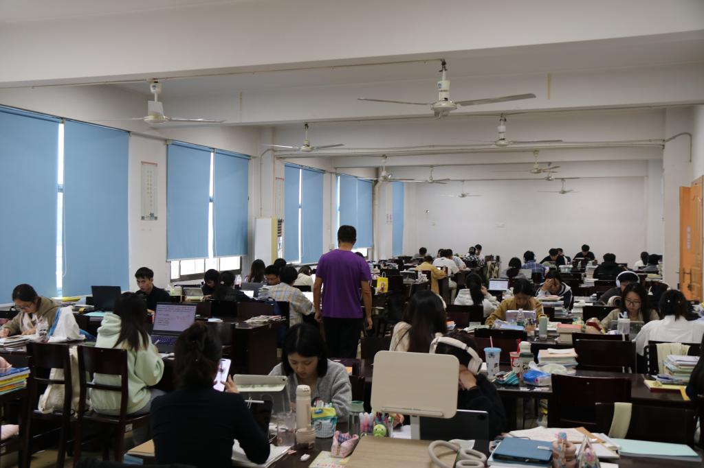 同时,各二级学院也十分重视图书馆考研自修室的服务工作。商学院党总支书记李向明亲自牵头部署,针对本学院图书馆考研自修室的备考学子建立了专门的“一日三巡”服务管理机制,安排专门的老师在上午、下午和晚上三个不同时间段到考研自修室进行巡查,及时了解学生的学习状态和需求,和图书馆一起为学子们打造出一片沉浸式学习“根据地”。考研自修室内浓厚的学习氛围已成为常态,每个人都在用专注与坚持诠释着“奋斗的青春最美丽”。