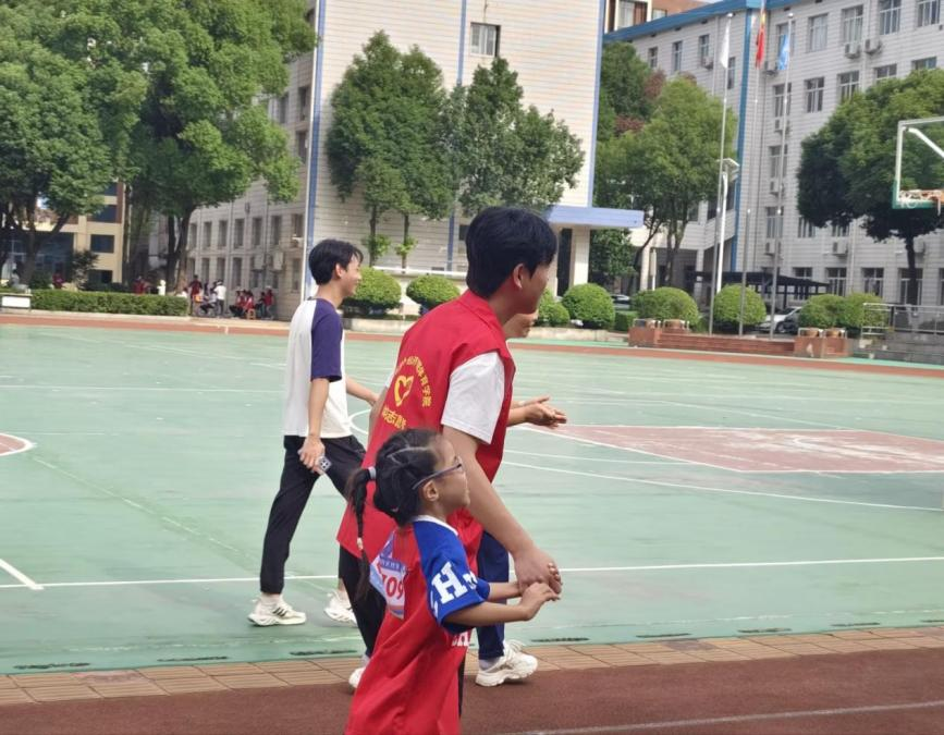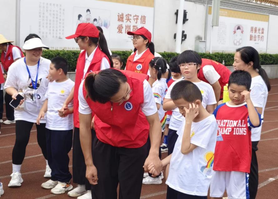 赛场之上,志愿者们是最可靠的“领航员”与“暖心人”。径赛发令时,他们同步挥舞醒目旗语,让听障孩子清晰捕捉起跑信号;视障孩子奔跑时,他们手牵手调整步频,轻声传递方向指引,冲线瞬间的紧紧相拥,定格下无数感动瞬间。跳绳区,志愿者半蹲计数,孩子疲惫时的一句“加油”温柔有力;拔河赛场,他们化身安全员紧盯动态,赛后第一时间扶起摔倒的孩子、递上温水,用行动告诉孩子们:参与的意义远胜于输赢。