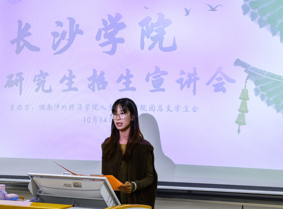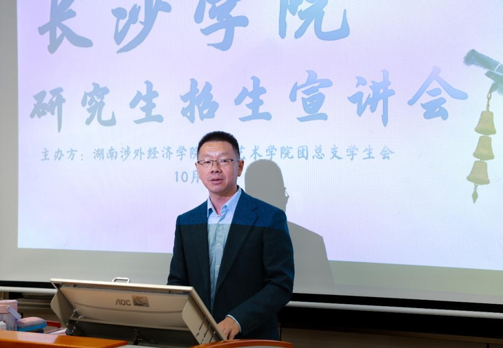 金秋送爽,研途启新。10月14日下午,由我校人文艺术学院承办的“长沙学院研究生招生宣讲会”第十一教学楼225教室顺利举行。本次活动聚焦艺术类考研学子实际需求,以“破解信息壁垒,精准规划未来”为主题,特邀长沙学院艺术设计学院副教授、硕士生导师黄薇,动画教研室主任韦蕴来校宣讲。人文艺术学院党总支书记廖立彬、大四年级艺术类辅导员及近100名有意考研的艺术类学生参与活动。
