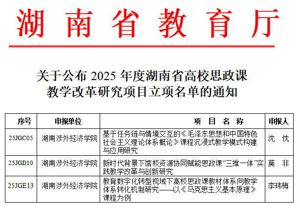 近日,湖南省教育厅公布了2025年度湖南省高校思政课教学改革研究项目立项名单,我校3个项目成功获批立项建设。