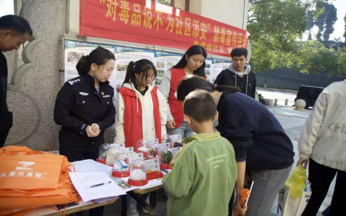为打破毒品“认知盲区”,活动设禁毒仿真模型展区。“商小蚁”志愿者协助民警摆放传统毒品与新型毒品模型,民警通过“实物对比+现场答疑”,讲解新型毒品伪装技巧强调“拒绝陌生人食品”“正规渠道购电子烟”等防范措施。商小蚁” 志愿者们则化身 “禁毒宣传员”,积极为社区居民派发禁毒资料,同步普及法规知识、强化防毒意识,让“珍爱生命、远离毒品” 的理念融入每个人的生活。
