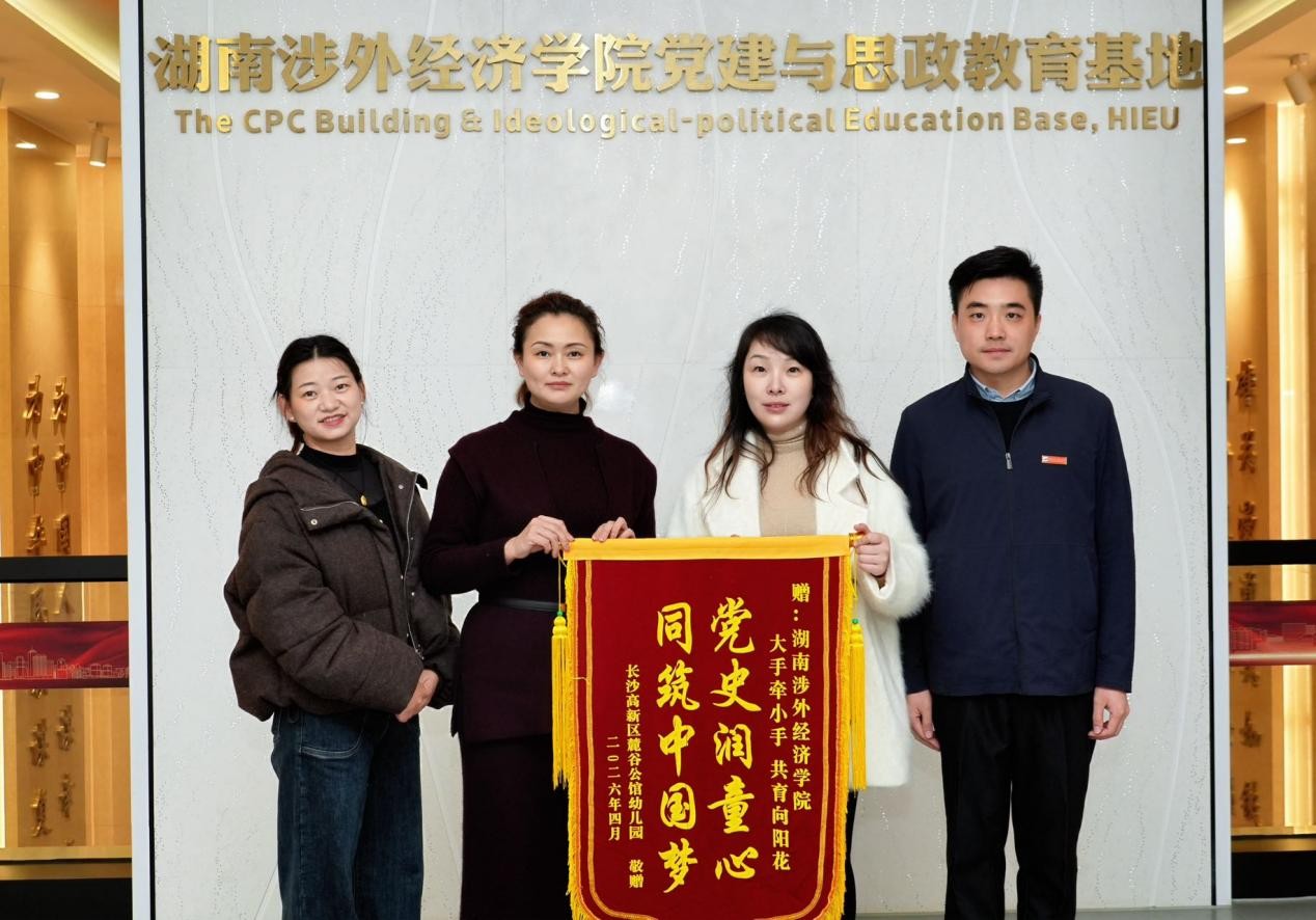 4月3日,长沙高新区麓谷公馆幼儿园专程来到我校党建与思政教育基地,将印有“大手牵小手,共育向阳花;党史润童心,同筑中国梦”的致谢锦旗送到学校,感谢我校外国语与国际教育学院精心开展红色研学、推进校幼协同育人。学校宣传部部长戴薇,外国语与国际教育学院党总支书记、执行院长许二鹏出席赠旗仪式,接收锦旗并与园方就深化校幼共建、丰富育人形式展开深入交流。此次赠旗,是对学院一院一品“红色摇篮”主题校幼共建研学活动的高度肯定。