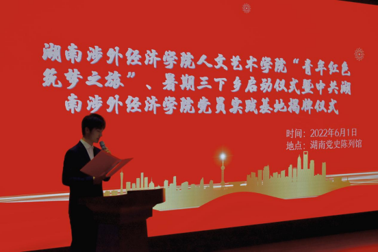 6月1日上午,我校人文艺术学院“青年红色筑梦之旅”、暑期三下乡启动仪式暨党建实践基地挂牌仪式在湖南党史陈列馆举行。湖南党史陈列馆副馆长罗珍泉、文创部部长刘诚;我校人文艺术学院党总支书记丁洋、副书记周孝贵,团总支书记陈燕,各支部书记、“青年红色筑梦之旅”复赛候选人以及五十余位预备党员代表到场参加仪式。