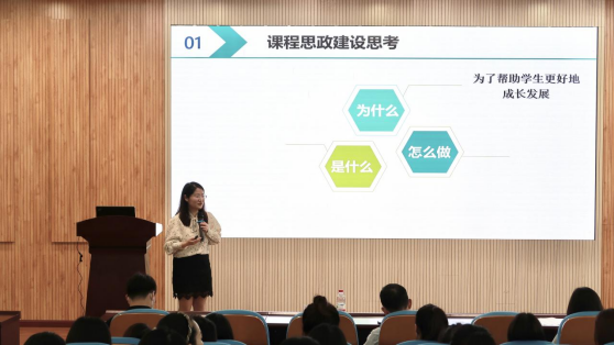 胡珂菲从分析教材,挖掘课程思政元素,发挥课程思政元素在人才培养中的作用等方面分享了课程思政育人的经验、体会与思考。她以“语言学概论”课程为例,向大家详细介绍了在课程思政教学竞赛中的备赛经验及方法。她指出,要坚持融入身边事、教育身边人,努力做到课程思政建设与知识的融合与相互促进,实现课程思政育人润物细无声。