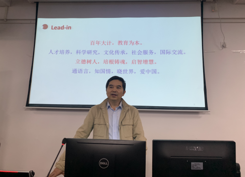 为深入推进学校课程思政建设,更好地发挥高质量课程的引领作用,推广课程思政建设的经验,加强教师间课程思政建设交流,5月13日上午,我校外国语学院在5教603举办了“课程思政示范课程”建设经验分享会,邀请湖南第一师范学院刘明东教授主讲。我校外国语学院院长姚佩芝、各系部主任及40多位教师参加会议,会议由外国语学院副院长曾望主持,