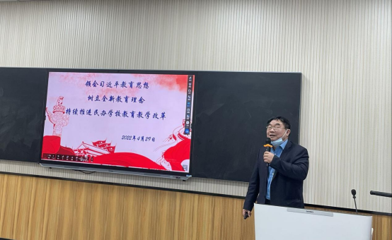 教学质量监控与评估中心王江浩老师以“领会习近平教育思想,树立全新教育理念,持续推进民办学校教育教学改革”为主题,做专题讨论。王江浩老师对习近平总书记教育理念及形成原因进行了深入分析,梳理了新时代的教育理念,并对民办学校的教育教学改革提出了建议。会后,大家围绕习近平教育思想展开了讨论交流。