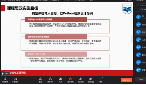 此次课程思政教学竞赛启动仪式和线上指导,既是信息与机电工程学院深入推进课程思政建设的一项必要工作安排,也是在疫情防控期间开展在线教学研讨的一次有益的尝试。通过此次会议,信息与机电工程学院教师对课程思政教学工作的认识进一步提高,明确了课程思政的深刻内涵及重要性,获得了课程思政教学的成功经验,也为如何结合工科类专业开展课程思政建设,奠定了良好的基础。