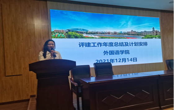 12月17日中午,外国语学院2021年度考核与评建工作暨年度总结大会在综合大楼召开,全院教职工欢聚一堂,回顾过去一年的成绩,谋划新起点下的发展规划。会议由外国语学院院长姚佩芝、副院长曾望共同主持。