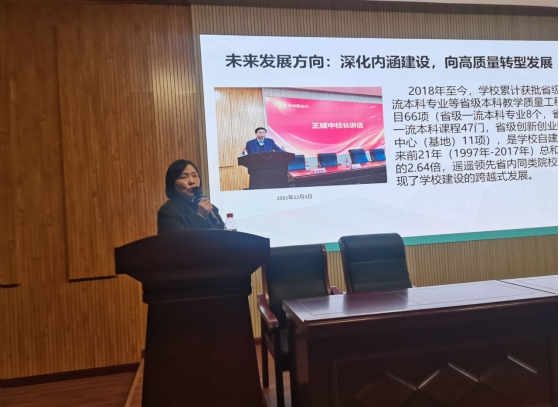 姚佩芝首先对所有老师在2021年为学院各项工作所做出的努力和贡献表示感谢,并表示将进一步完善各种管理制度,使管理更加规范、决策民主公正、信息公开透明、执行上更加有效,营造团结和谐、积极奋进的文化氛围。她从以下四个方面总结了2021年的主要工作:一是制定科学合理的年绩效、年终奖、年度岗位考核标准,优化绩效考核和激励措施;二是筹集多方资源,激励教员投身教学、提升学术水平、积极参与学院科研事务;三是落实学院核心课程的教材编写,在教材建设上取得突破,着手建设一套具有外院特色的教材;四是与政府、企业、社区、学校等共建“学习型-科研型-管理型”双师双能型教师,推进教师培训、学术交流、实践调研、等共建活动。