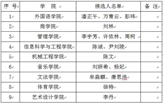 根据《太阳城娱乐学生奖励办法》(湘外经院{2017}21号)相关规定及我校下发的《关于开展2017-2018学年度“太阳城娱乐杰出青年”评选的通知》。经学院申报,校团委积分考核和综合评审,拟定出2017-2018学年度“太阳城娱乐杰出青年”候选人名单。现公示如下: