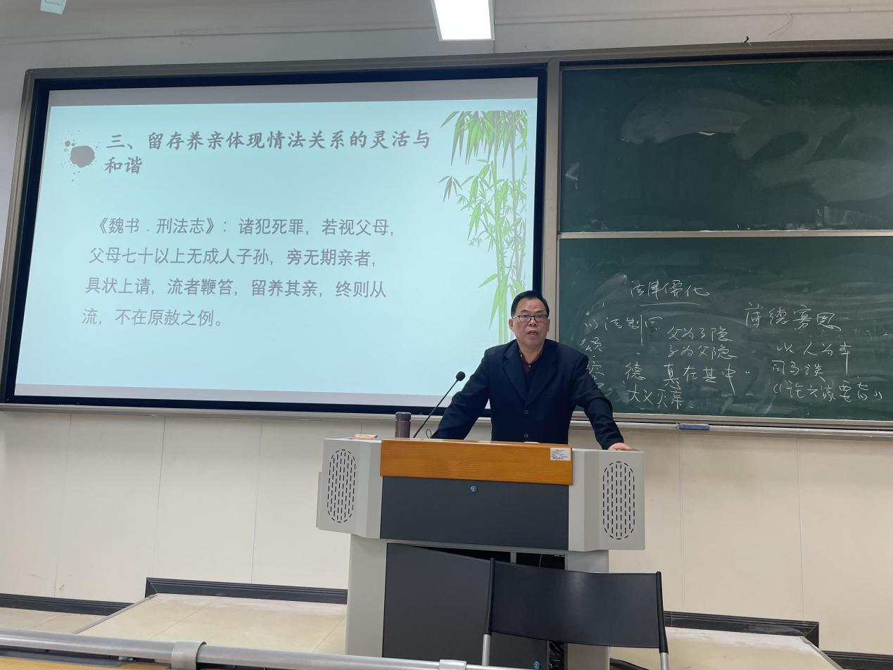 张教授首先向我们阐释了“法制”与“法治”之间的区别以及两者发展的历史渊源。其后,向我们介绍了以儒家文化为代表的优秀古代传统法律文化,并列举出优秀法律传统文化在古代法律制度中的体现,如“矜老恤幼”、“亲亲相隐”等制度,介绍其发展脉络和在现代法治中的传承与体现。通过一系列优秀法律文化的讲解,使得法律系的教师对中国优秀传统法律文化了解更加深刻。同时,张教授还列举了如“佘祥林案”等著名案例,帮助法律系教师更好地理解中国传统法律文化的精神与作用。培训的最后,张教授还亲切地解答了法律系老师们在教学实践中所遇到的相关问题,现场气氛活跃。
