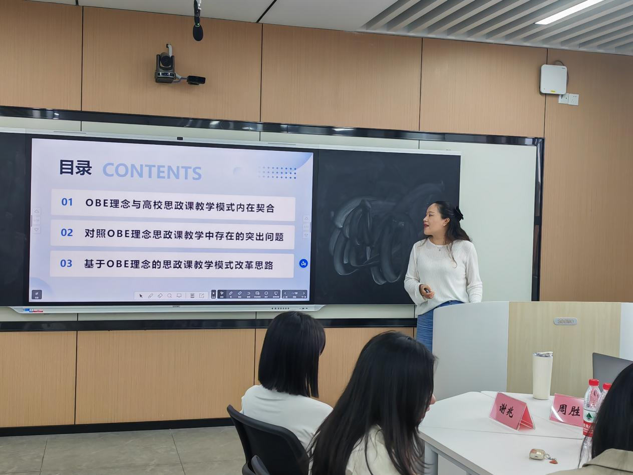 马克思主义学院姜莉老师结合思政课实践经验,分享了思政课与OBE理念结合的实践途径。姜老师认为可通过设定明确的学习目标、开展实践活动、组织案例分析等方式,将OBE理念融入思政课程目标设定与教学设计之中,从而激发学生的学习动力和兴趣。